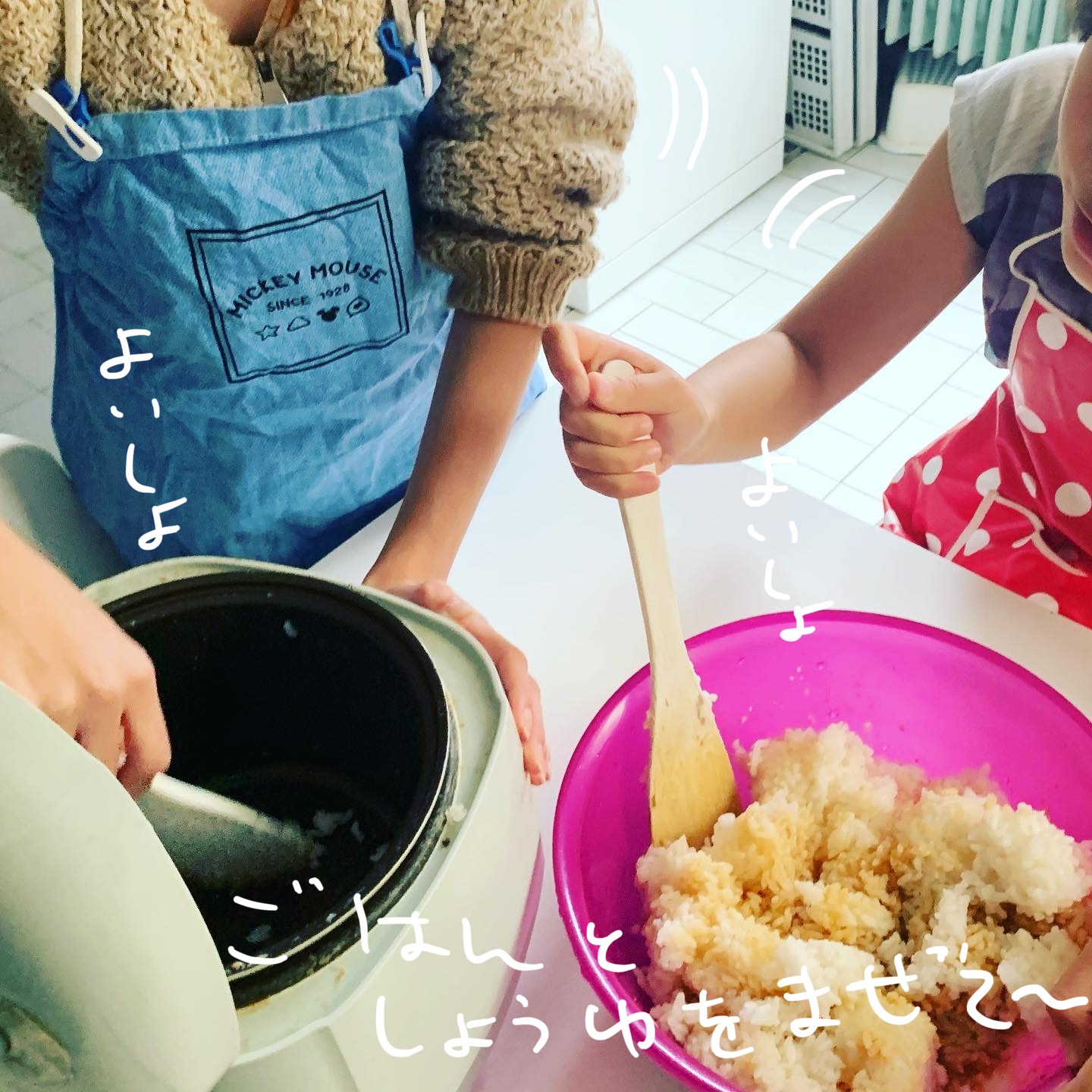 ケチャップライスと醤油ライスはおにぎりの形に作っておくと便利やけど、疲れていたりして握るのが面倒!という時にはどこからともなく3人の天使が舞い降りてギュッギュと握ってくれます。