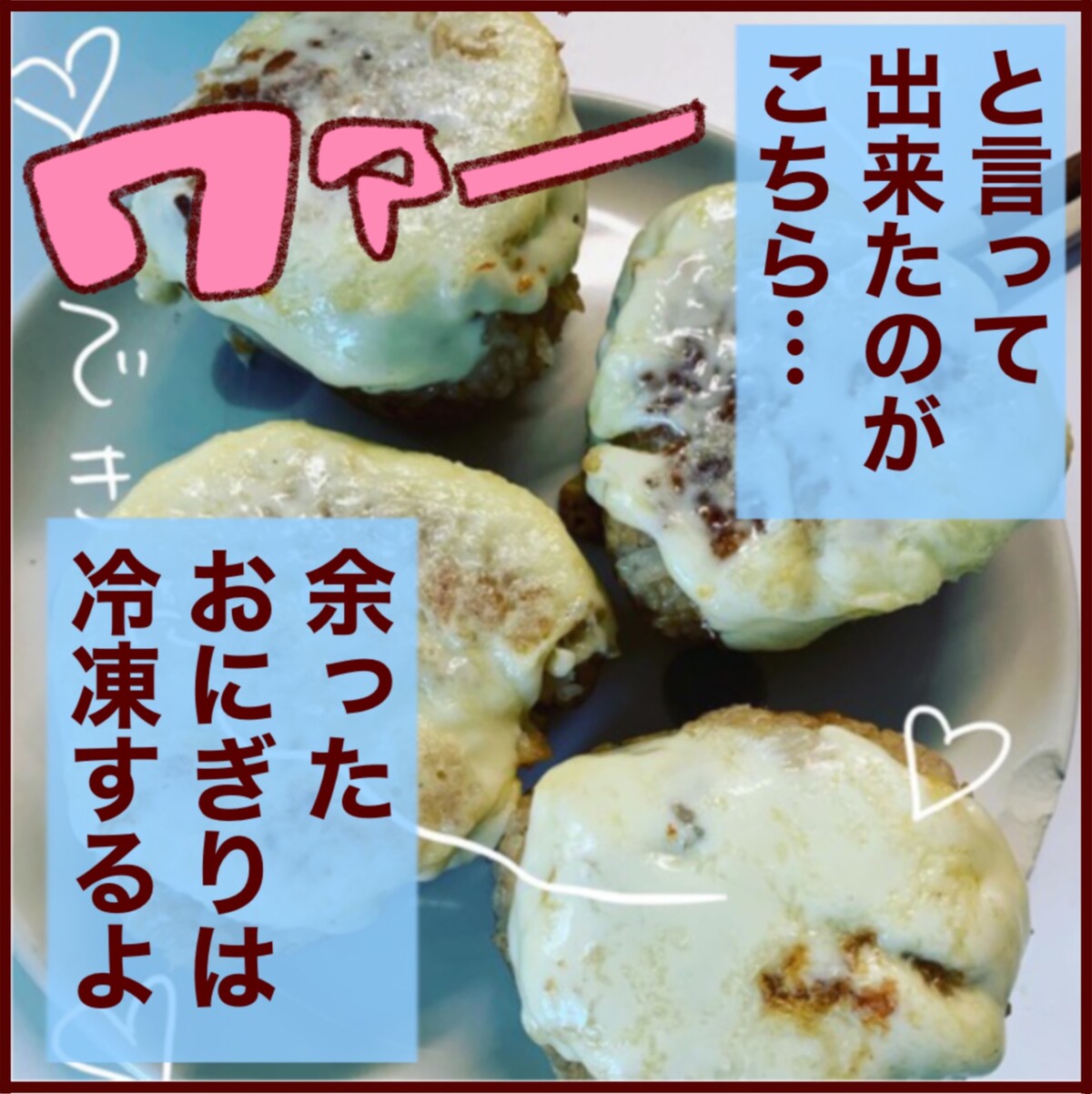この時チーズを乗せてもいいし、おにぎりだけ焼いてチーズは後で乗せてレンジでチンしても良いです。