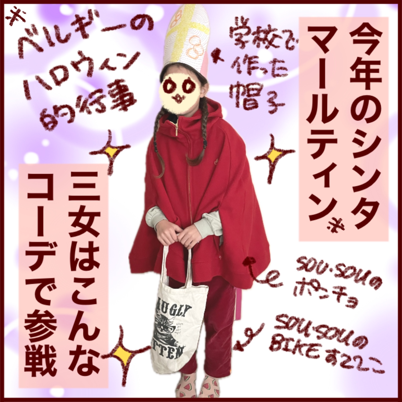 起源のところを見てもらうと分かってもらえると思うんやけど、シンタマールティンの服装は赤いマントがポイントなので今回の赤いポンチョとかはうってつけってワケなのですよ。