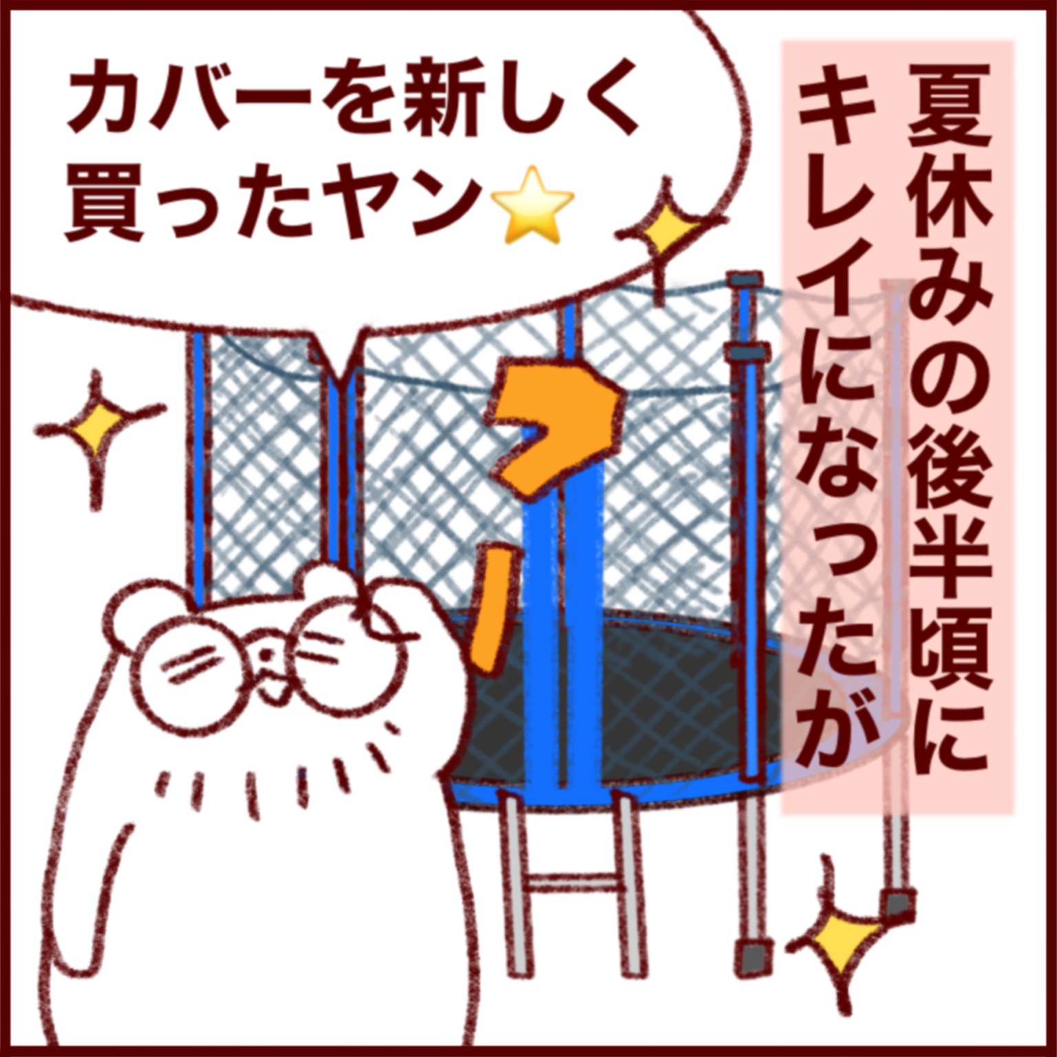 漫画の通りボロボロになっても撤去するどころか、夫は新しいカバーを買ってきて(その金額は恐ろしくて聞いていない)つける始末。